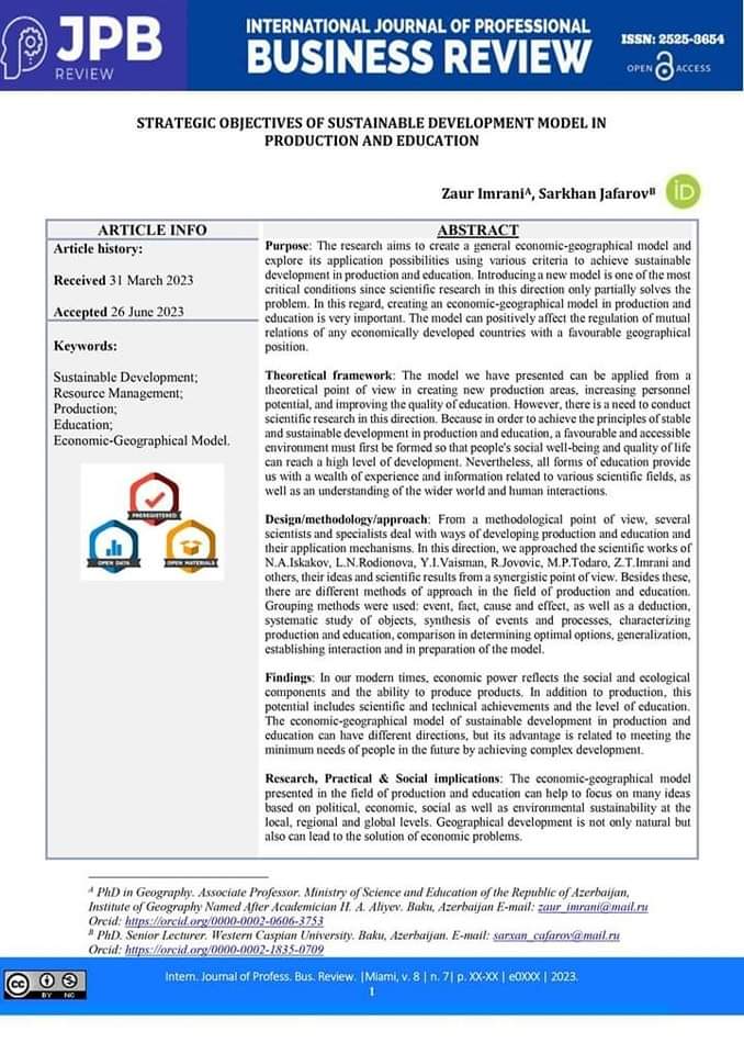 Azərbaycan Dövlət Pedaqoji Universitetin (ADPU) Quba filialının Ədəbiyyat və dillər kafedrasının baş müəllimi Sərxan Cəfərovun coğrafiyaçı alim Zaur İmrani ilə birlikdə WoS və SCOPUS elmmetrik bazalarında indekslənən, 0.4 impakt faktor, Q4 kateqoriya göstəricili “International Journal of Professional Business Review” jurnalında məqalələri çap olunub.