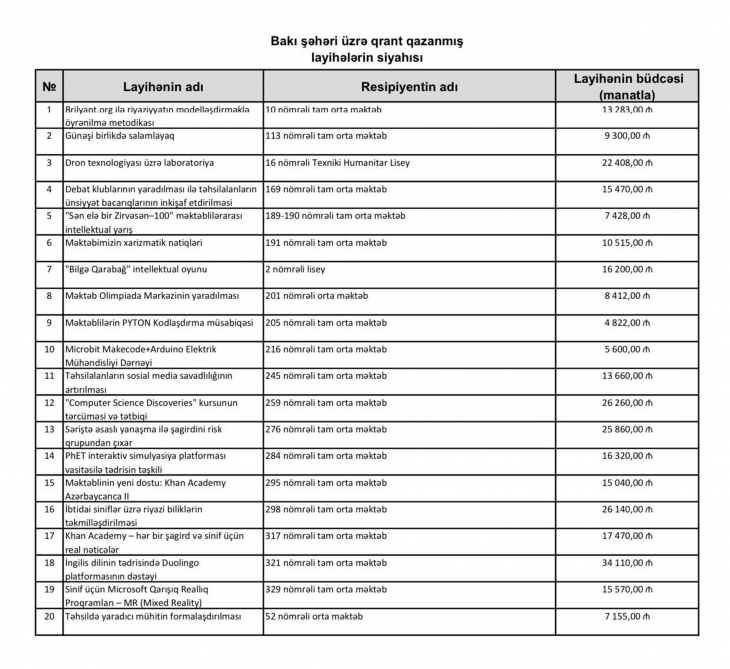 Qrant qazanmış resipiyentlər layihələr üzrə müqavilələrin bağlanılması üçün yaxın günlərdə Bakı Şəhəri üzrə Təhsil İdarəsinə dəvət ediləcəklər.