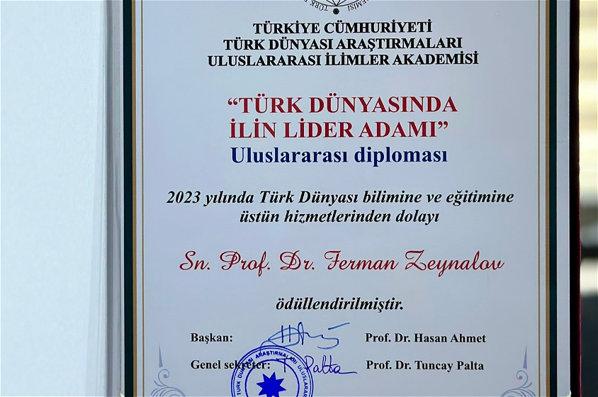 ADU-dan "Tehsil.biz"ə bildirilib ki, Fərman Zeynalov həmçinin Türk Dünyası Araşdırmaları Beynəlxalq Elmlər Akademiyası tərəfindən Türk Dünyası elminə və təhsilinə verdiyi töhfələrinə görə “Türk Dünyasında İlin Lider Adamı” diplomu ilə təltif edilib.