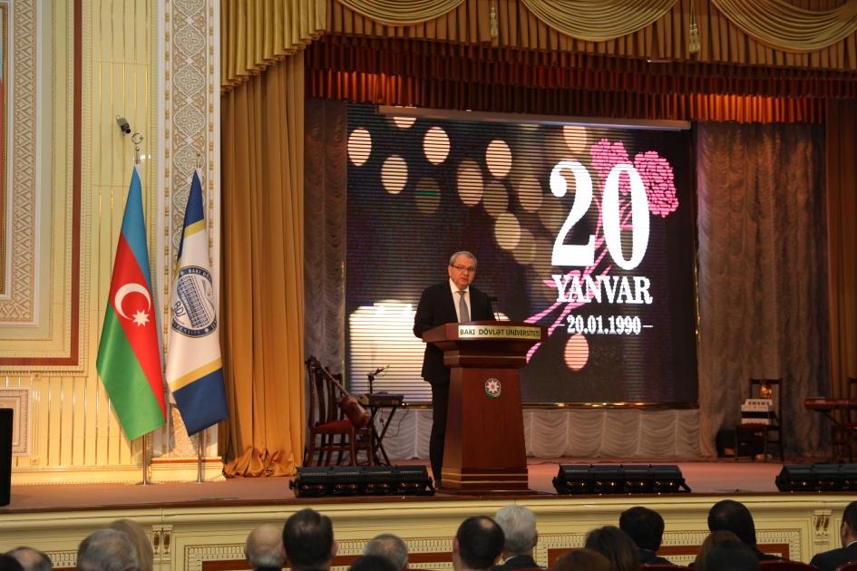 BDU-nun rektoru Elçin Babayev çıxış edərək bildirib ki, 20 Yanvar Azərbaycanın müasir tarixinə ən faciəli günlərdən biri, eyni zamanda, qəhrəmanlıq səhifəsi kimi daxil olub. 20 Yanvar xalqımızın müstəqillik, azadlıq uğrunda mübarizəsinin və yenilməz iradəsinin rəmzinə çevrilib. Keçmiş sovet ordusunun həmin gün Azərbaycan xalqına qarşı həyata keçirdiyi hərbi təcavüz insanlıq əleyhinə törədilmiş ən ağır cinayətlərdən biri kimi bəşər tarixinə həkk olunub. Rektor vurğulayıb ki, doğma Vətəninin, xalqının azadlığını, şərəf və ləyaqətini hər şeydən uca tutan vətənpərvər Azərbaycan övladları həmin müdhiş gecədə qəhrəmanlıq nümunəsi göstərdilər. Bu hadisə Azərbaycan milli kimliyinin formalaşmasına həlledici təsir göstərdi, dövlət müstəqilliyinin bərpa edilməsində dönüş nöqtəsi oldu. Məhz bu faciədən sonra milli azadlıq hərəkatı tam siyasi reallığa çevrilib, dönməz xarakter alıb, xalq öz gələcəyini yalnız müstəqil Azərbaycanda görüb. O zaman yalnız Ümummilli Liderimiz Heydər Əliyev siyasi iradə nümayiş etdirərək və Moskvadakı Azərbaycan nümayəndəliyinə gələrək SSRİ rəhbərliyinin törətdiyi bu cinayəti qətiyyətlə ittiham edib. Ulu Öndər Heydər Əliyevin Azərbaycan rəhbərliyinə qayıdışından sonra, 1994-cü il martın 29-da Ümummilli Liderin təşəbbüsü ilə 20 Yanvar faciəsinə ali qanunvericilik orqanı - Milli Məclis səviyyəsində ilk dəfə hüquqi-siyasi qiymət verilib.