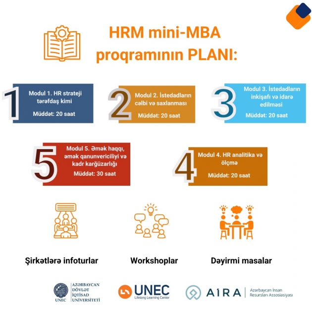 Mini-MBA proqramı HR idarəedilməsi sahəsində çalışanların idarəetmə bacarıqlarını inkişaf etdirmək məqsədi daşıyır və bu istiqamətdə xüsusi təcrübələrə uyğunlaşdırılıb.