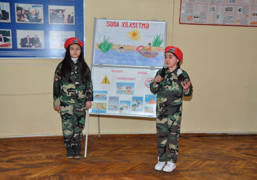 Bakı şəhəri 114 və 84 nömrəli tam orta məktəblərdə təşkil olunan tədbirlərdə fövqəladə hallar zamanı davranış, suda boğulma, yanğın və dəm qazı zəhərlənmələri ilə əlaqədar təhlükəsizlik qaydaları və digər mövzular barədə məlumat verilib. Təhsil müəssisələrinin müəllim-şagird heyətinin diqqətini baş verə biləcək fövqəladə hallar zamanı davranış qaydalarının mənimsənilməsinə yönəltməyin və bu istiqamətdə onların bilik və bacarıqlarının artırılmasının vacibliyindən bəhs edilib.