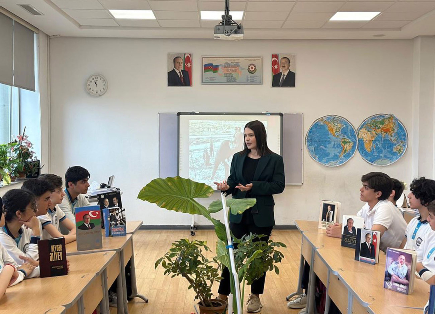 Ulu Öndər Heydər Əliyevin Azərbaycan xalqının tarix boyu yetişdirdiyi nadir və bənzərsiz şəxsiyyət kimi milyonlarla insanın qəlbində əbədi yaşadığı vurğulanıb. Ümummilli Liderin ideyalarının Azərbaycan Prezidenti İlham Əliyev tərəfindən qətiyyətlə həyata keçirildiyi bildirilib. Heydər Əliyevin müəyyənləşdirdiyi siyasi xətti özündən sonra uğurla davam etdirən Prezident, Müzəffər Ali Baş Komandan İlham Əliyevin yürütdüyü uzaqgörən siyasət nəticəsində ərazi bütövlüyümüzün və suverenliyimizin təmin olunduğu şagirdlərin diqqətinə çatdırılıb.