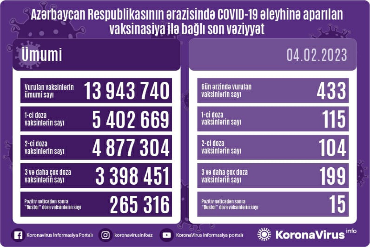 Vurulan vaksinlərin ümumi sayı 13943740, birinci mərhələ üzrə vaksinasiya olunanların ümumi sayı 5402669, ikinci mərhələ üzrə vaksinasiya olunanların sayı 4877304, üç və daha çox doza üzrə vaksinasiya olunanların sayı 3398451, pozitiv nəticədən sonra buster doza üzrə vaksinasiya olunanların sayı isə 265316 nəfər təşkil edir.