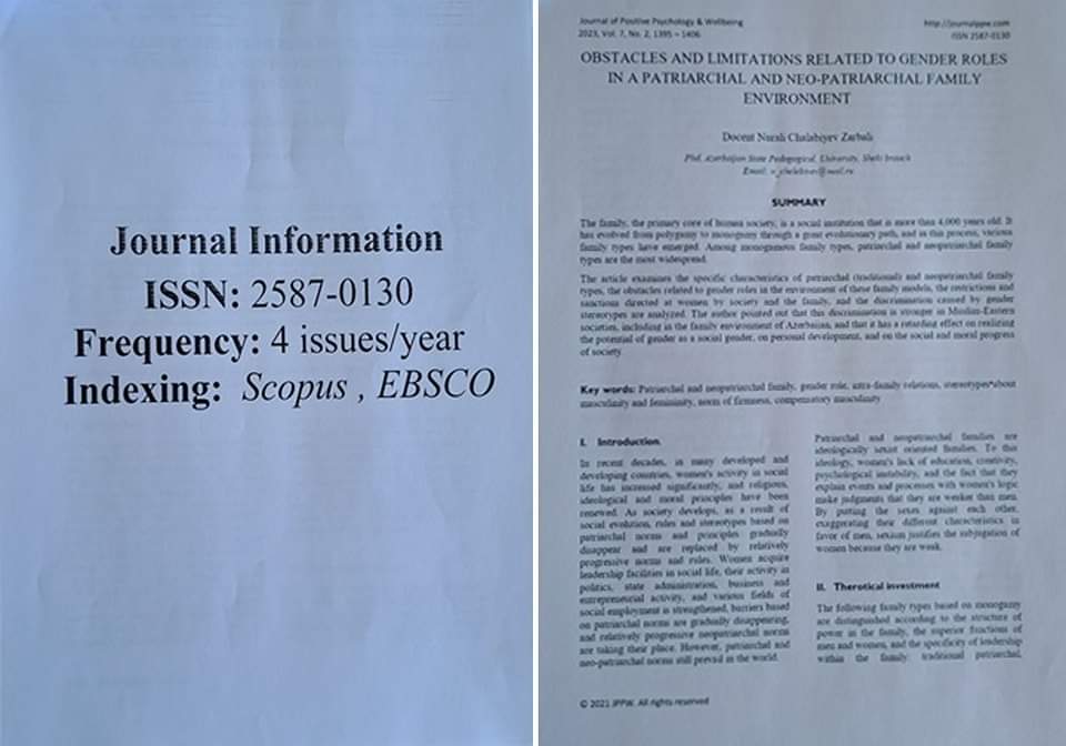 ADPU-nun Şəki filialının elmi işlər üzrə direktor müavini dosent Nuralı Çələbiyevin “Patriarxal və neopatriarxal ailə mühitində gender rollarına qarşı maneə və məhdudiyyətlər” adlı yeni elmi məqaləsi isə Türkiyə Respublikasında nəşr olunan və SCOPUS və EBSCO elmmetrik bazalarında indekslənən H-12 indeksli (kvartil-Q-1) “Pozitiv Psixologiya və Rifah” juralında (2023-cü il,cild 7, N2, səh. 1395-1406) ingilis dilində nəşr olunub