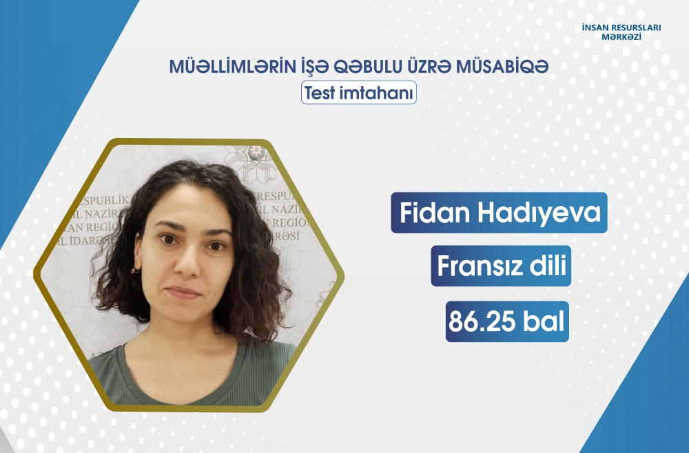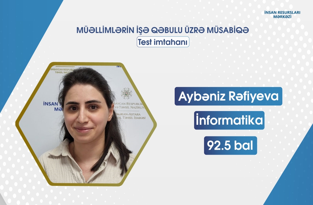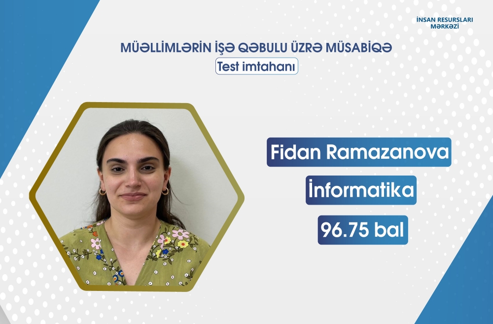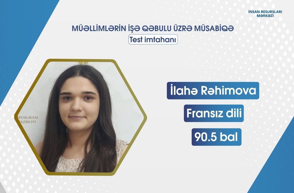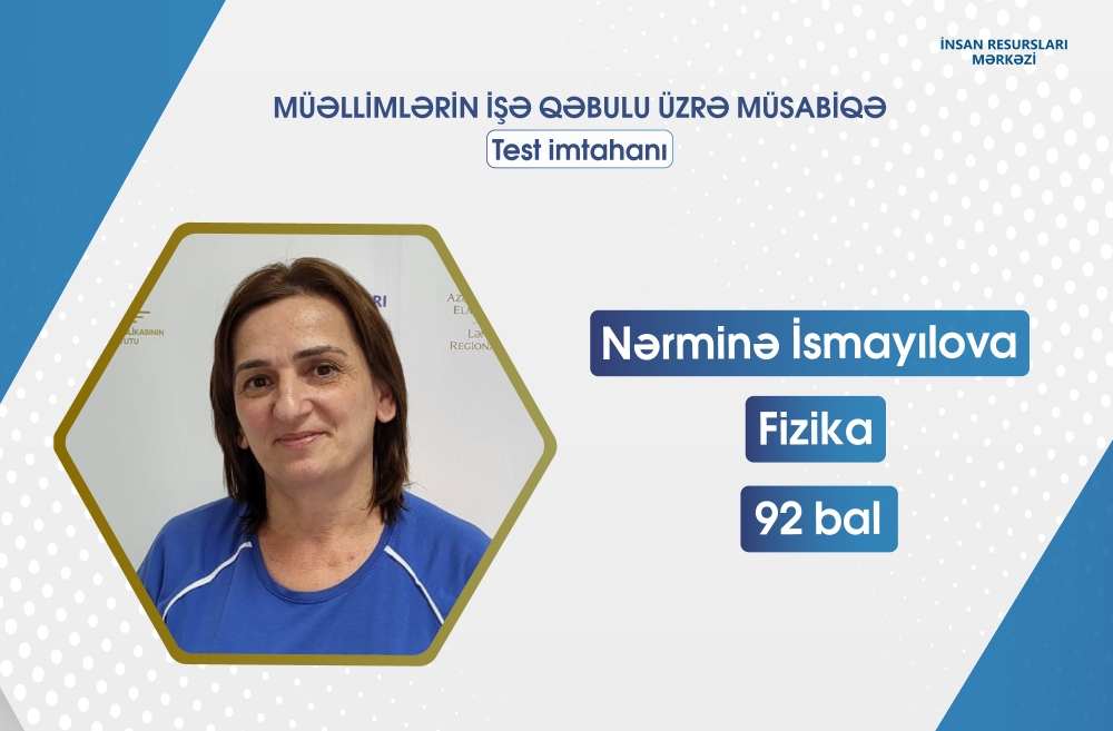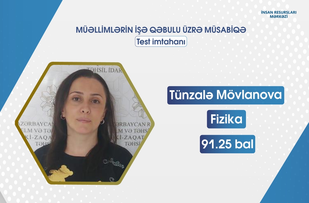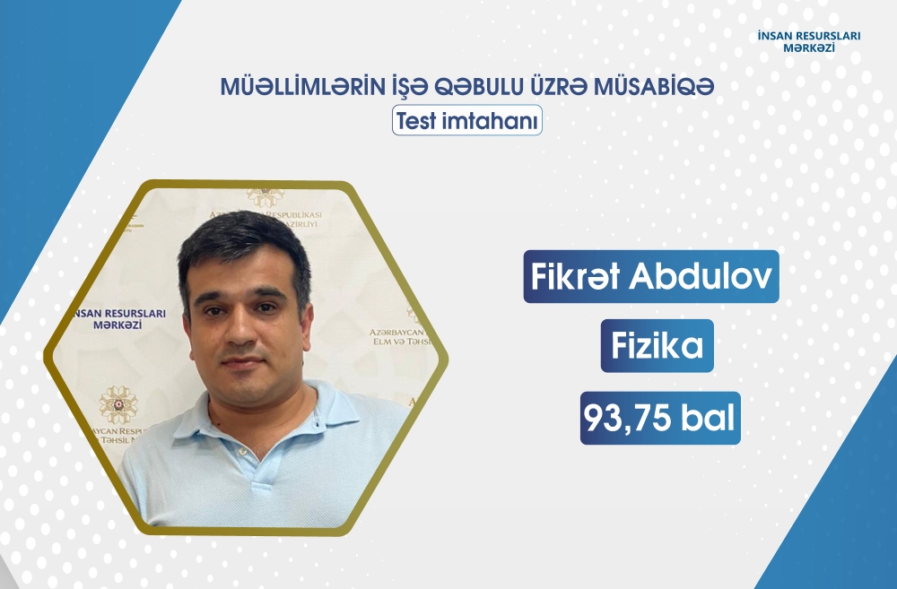 Təhsil İnstitutunun nəzdində İnsan Resursları Mərkəzindən "Tehsil.biz"ə bildirilib ki, test imtahanı mərhələsində fizika fənni üzrə ən yüksək balı Fikrət Abdulov (93,75), Nərminə İsmayılova (92) və Tünzalə Mövlanova (91.25), fransız dili fənni üzrə isə ən yüksək balı İlahə Rəhimova (90,5), Sədəf Bağıyeva (87,5) və Fidan Hadıyeva (86,25), informatika fənni üzrə Fidan Ramazanova (96,75), Mirvari Zərbəliyeva (93,25) və Aybəniz Rəfiyeva (92,5) toplayıblar.