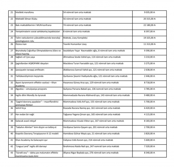 Qrant qazanmış resipiyentlər layihələr üzrə müqavilələrin bağlanılması üçün yaxın günlərdə Bakı Şəhəri üzrə Təhsil İdarəsinə dəvət ediləcəklər.