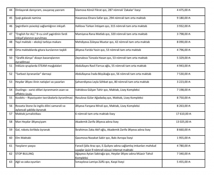 Təhsildə inkişaf və innovasiyalar üzrə VII qrant müsabiqəsində paytaxt üzrə 63 layihə qalib olub, onlardan 26-sı ümumi təhsil müəssisələri kateqoriyası, 37-si isə fərdi kateqoriya üzrə fərqlənib.