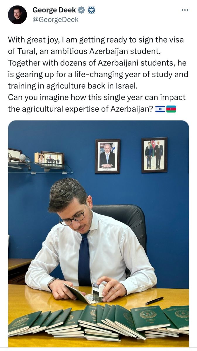 Tehsil.biz xəbər verir ki, bu barədə İsrailin Azərbaycandakı səfiri Corc Dik tviter səhifəsində məlumat verib.