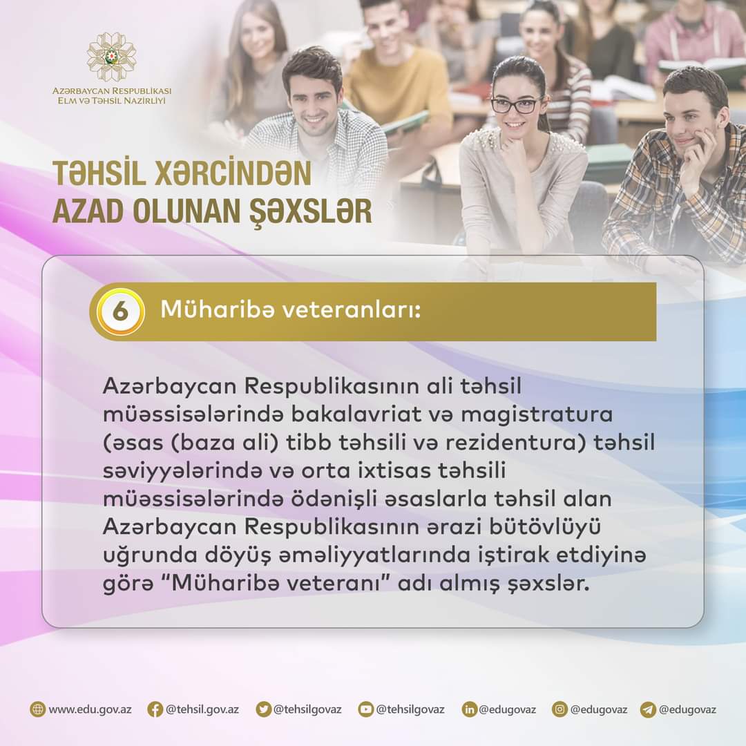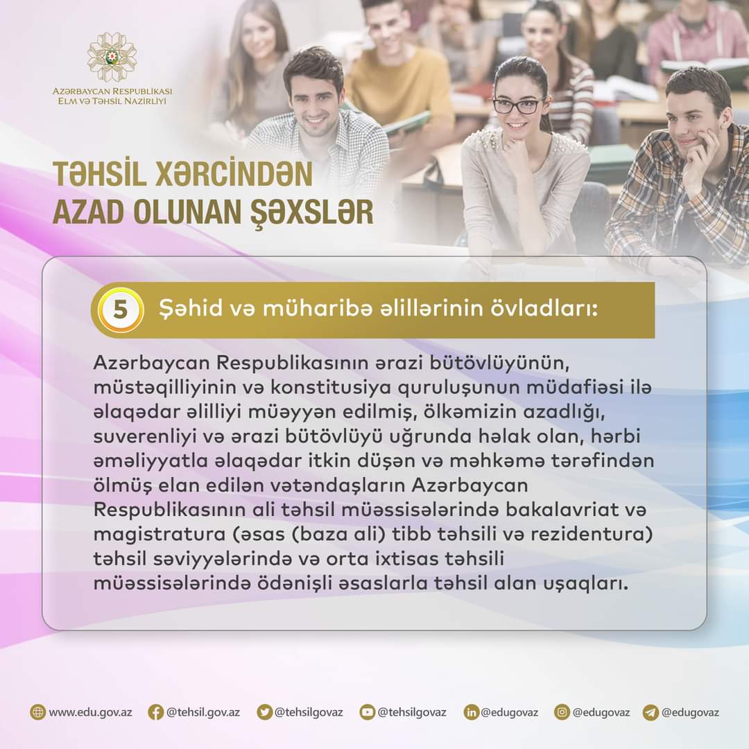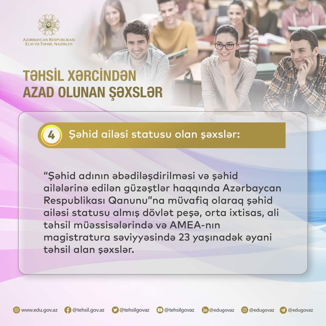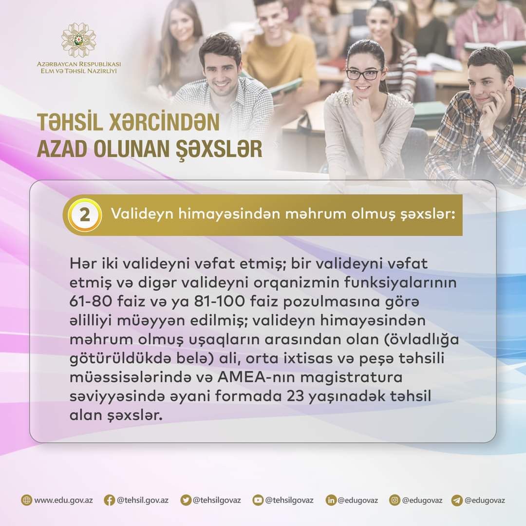 Təhsilin müxtəlif pillə və səviyyələri üzrə təhsil xərcindən azad olunan imtiyazlı şəxslərin kateqoriyasını açıqlanıb.