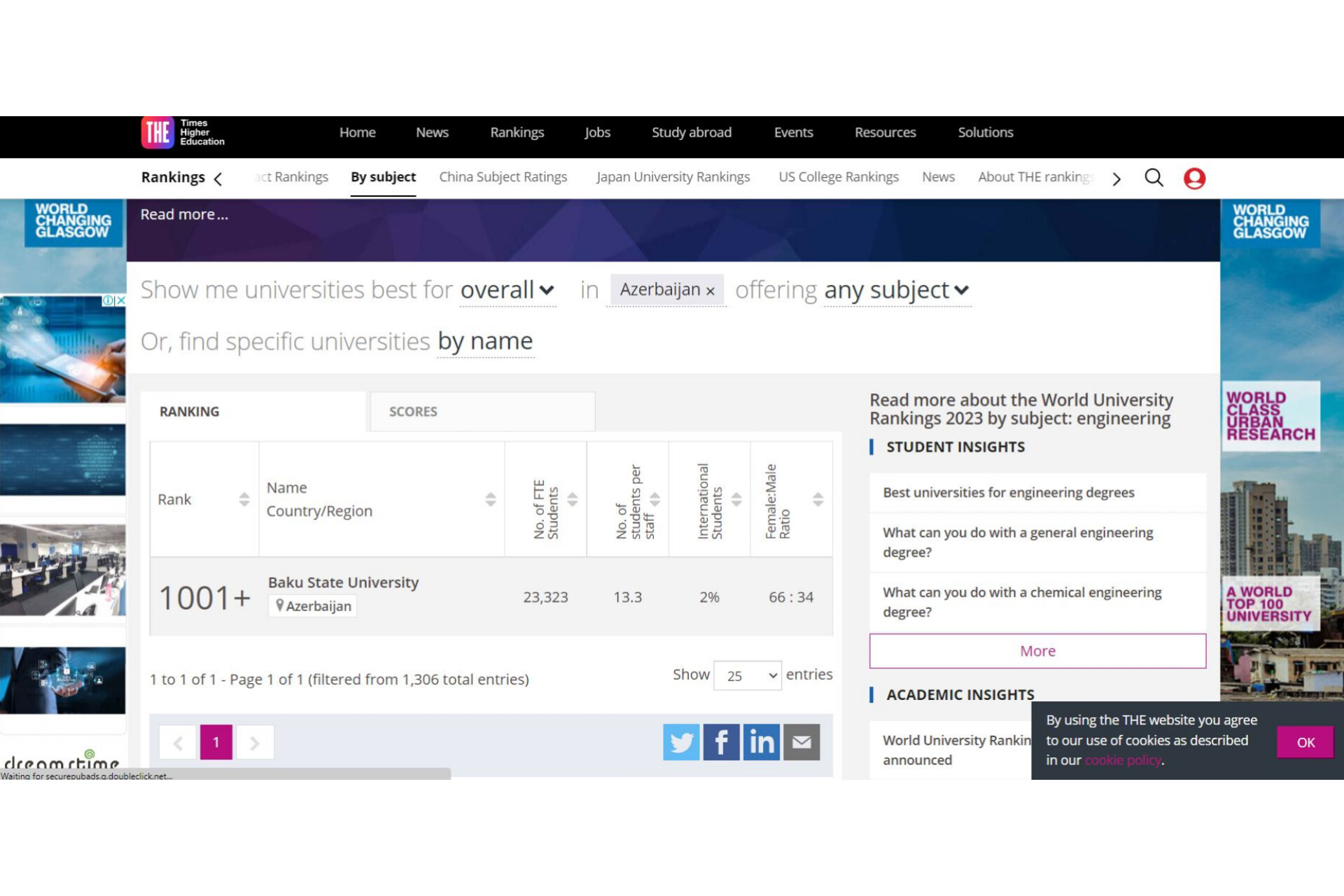 Məlumat üçün bildirək ki, BDU Azərbaycanda “Times Higher Education Subject Ranking” reytinq cədvəlinə düşən yeganə universitetdir. Belə ki, BDU Fiziki elmlər (Fizika, Kimya, Geologiya, Astronomiya, Riyaziyyat və s.) və Mühəndislik elmləri (Kimya mühəndisliyi, Geologiya mühəndisliyi, Hidrogeologiya mühəndisliyi, Geofizika mühəndisliyi və s.) üzrə 1001+ mövqelərini tutub.