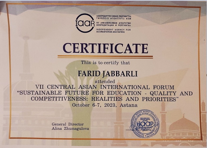 Azərbaycan Turizm və Menecment Universitetini təhsil məsələləri üzrə rektor müşaviri Fərid Cabbarlı Qazaxıstanın Astana şəhərində Müstəqil Akkreditasiya və Reytinq Agentliyinin (IAAR) təşkilatçılığı ilə keçirilən “Təhsildə keyfiyyət təminatı: VII Mərkəzi Asiya Beynəlxalq Forumu”nda iştirak edib. Beynəlxalq tədbir “Təhsildə davamlı gələcək - keyfiyyət və rəqabətqabiliyyətlilik: tarixi perspektiv, reallıqlar və prioritetlər” mövzusuna həsr olunub.
