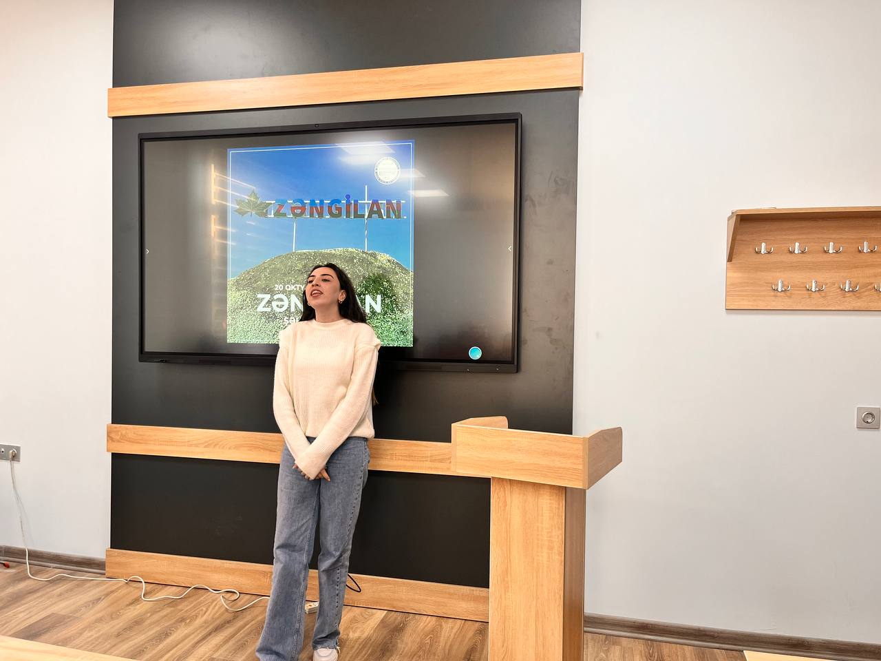 İnformasiya və sənəd menecmenti fakültəsinin müəllimi, qazi anası Vəzufə Xudiyeva Prezident İlham Əliyevin “Azərbaycan Respublikasının işğaldan azad edilmiş əraziləri üzrə şəhər günlərinin təsis edilməsi haqqında” 31 iyul 2023-cü il tarixli Sərəncamını xatırladıb, sənədin tarixi əhəmiyyətini vurğulayıb: “Cəbrayıl və Füzuli şəhərlərindən sonra 20 oktyabr 2020-ci ildə xüsusi strateji əhəmiyyətə malik olan Zəngilan şəhərinin işğaldan azad edilməsi xalqımızda yüksək əhval-ruhiyyə, müharibədə tarixi qələbə əldə edəcəyimizə sarılmaz inam hissi yaratdı”. Vəzufə Xudiyeva vurğulayıb ki, Azərbaycan Respublikasının Prezidenti, Müzəffər Ali Baş Komandan İlham Əliyevin göstərişi əsasında işğaldan azad olunmuş ərazilərdə birinci pilot layihə Zəngilan rayonun Ağalı kəndində icra edilib, yüzlərlə sakin artıq öz doğma yudlarında məskunlaşıblar. Sonra kafeda müdirləri Elçin Əhmədov, Nadir İsmayılov çıxış ediblər. Çıxışlarda Qarabağda aparılan son antiterror tədbirləri nəticəsində dövlətimizin suverenliyinin tam bərpa olunmasından, Xankəndi, Xocalı, Ağdərə, Xocavənd şəhərlərində, Əsgəran qəsəbəsində, Sərsəng su anbarının ərazisində Dövlət Bayrağımızı ucaldılmasından, xalqımıza qarşı soyqırımı törətmiş cinayətkarların həbs olunaraq ədalət məhkəməsinin mühakiməsinə verilməsindən qürurla bəhs edilib.