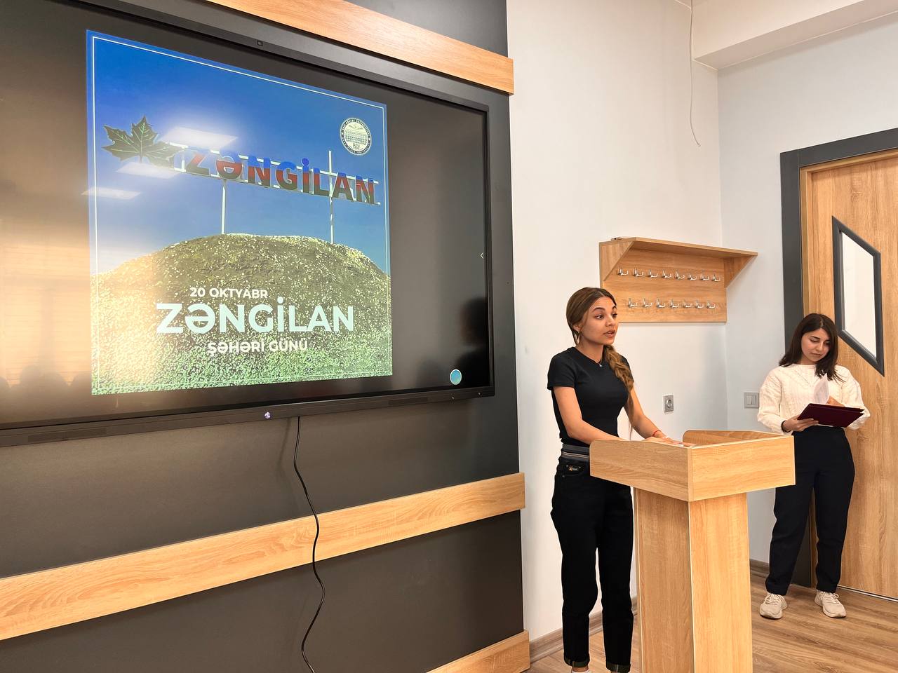 Bakı Dövlət Universitetinin (BDU) İnformasiya və sənəd menecmenti fakültəsində Tələbə Gənclər Təşkilatının (TGT) təşəbbüsü ilə 20 oktyabr – Zəngilan Şəhəri Günü münasibətilə tədbir keçirilib.