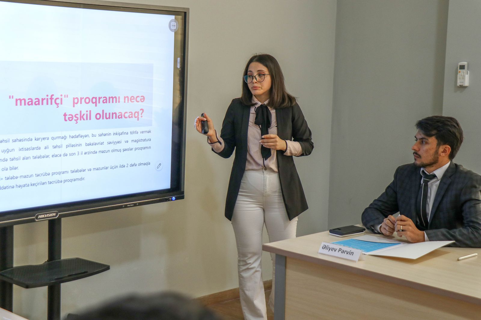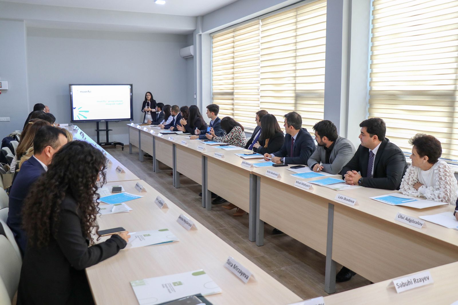 Daha sonra nazirliyin əməkdaşı Sara Mirzəyeva tərəfindən “Maarifçi” tələbə-məzun təcrübə proqramının məqsədləri, hədəf qrupu, gözlənilən nəticələri və fəaliyyətinin təşkili barədə təqdimat nümayiş etdirilib.