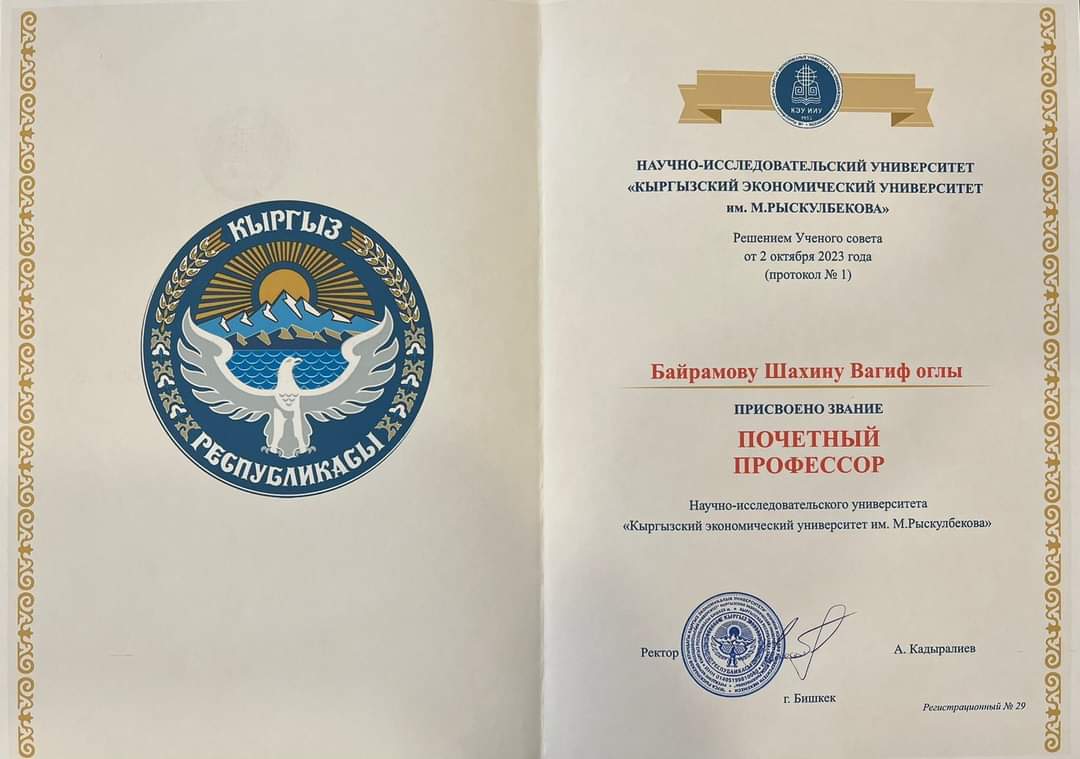 Mingəçevir Dövlət Universitetinin (MDU) rektoru Şahin Bayramov M.Rıskulbekov adına Qırğız İqtisad Universitetinin (KEU) fəxri professoru adına layiq görülüb.