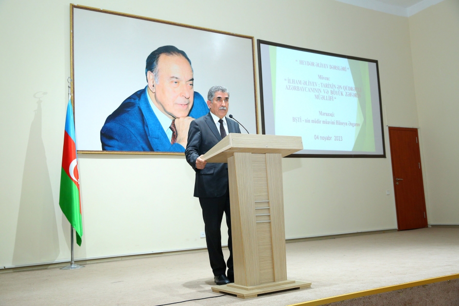 BŞTİ-nin müdir müavini Hüseyn Əsgərov “İlham Əliyev: tarixin ən qüdrətli Azərbaycanının və Böyük Zəfərin müəllifi” mövzusunda məruzə ilə çıxış edib. H.Əsgərov müasir müstəqil Azərbaycan dövlətinin memarı və qurucusu Heydər Əliyevin həyata keçirdiyi uğurlu siyasət barədə ətraflı məlumat verib.