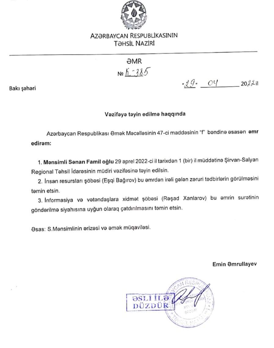 "Sənan Mənsimli 29.04.2022-ci il tarixdə elm və təhsil naziri Emin Əmrullayevin müvafiq əmri ilə Şirvan-Salyan Regional Təhsil İdarəsinin müdiri vəzifəsinə təyinat (işə təyinat əmri əlavə olunur) almışdır. Əmrlərdən göründüyü kimi, İbrahim Hüseynovun Qarabağlı kənd 1 nömrəli tam orta məktəbində işə təyinatı Şirvan-Salyan Regional Təhsil İdarəsinin yaranmasından öncəki dövrə təsadüf edir.