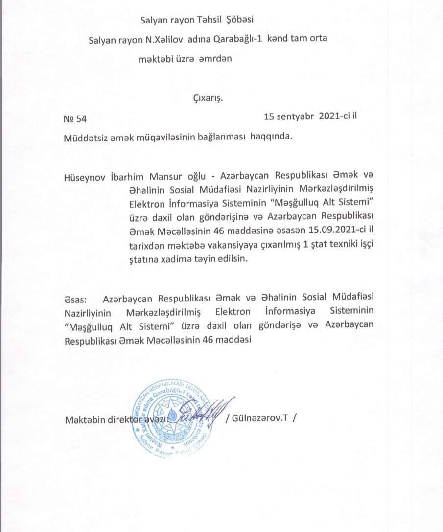 "Son günlər millət vəkilləri tərəfindən sosial mediada Salyan rayon sakini İbrahim Hüseynovun texniki ştat vahidi üzrə işə götürülməsi, vəzifəsinin dəyişdirilməsi ilə bağlı paylaşılan məlumatlar Şirvan-Salyan Regional Təhsil İdarəsi tərəfindən araşdırılmış və məsələ ilə bağlı açıqlama verilib".