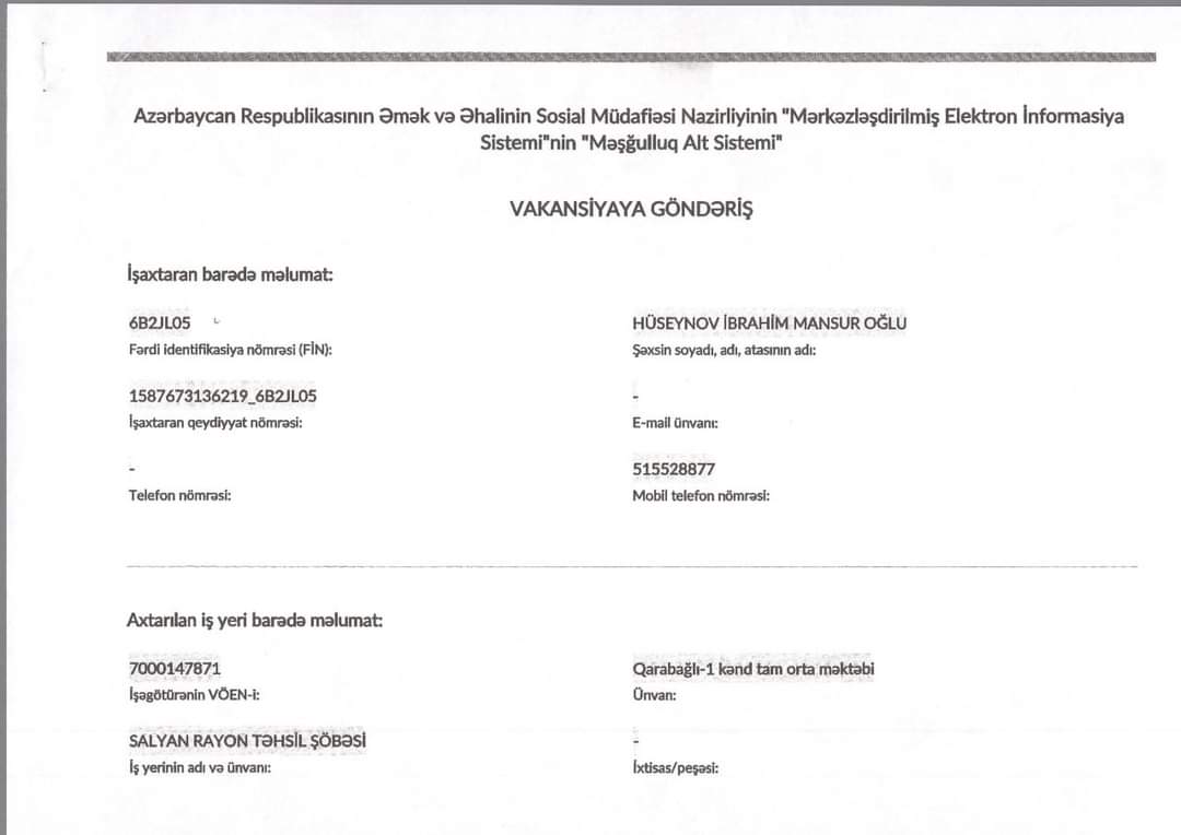 Millət vəkilləri Fəzail Ağamalı və Etibar Əliyevin sosial mediada verdikləri, reallığı əks etdirməyən birtərəfli məlumatlara cavab olaraq bir daha bildirilib ki, Sənan Mənsimli tərəfindən işə götürülməsi iddia edilən İbrahim Hüseynov öz xahişi və müraciəti əsasında Azərbaycan Respublikasının Əmək və Əhalinin Sosial Müdafiəsi Nazirliyinin "Mərkəzləşdirilmiş Elektron İnformasiya Sistemi"nin Məşğulluq Alt Sisteminin vakansiya göndərişi əsasında 15.09.2021-ci ildə Salyan rayonu Qarabağlı kənd 1 nömrəli tam orta məktəb direktorunun əmri ilə texniki vəzifə üzrə işlə təmin olunub.