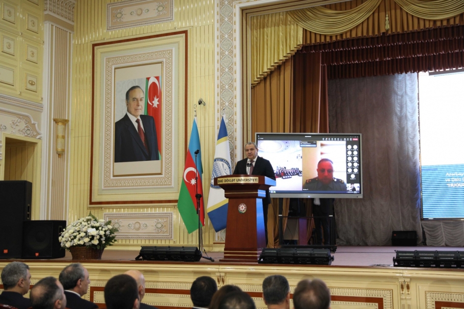 Tədbirdə çıxış edən BDU-nun rektoru Elçin Babayev bildirib ki, Ümummilli Lider Heydər Əliyev milli dövlətçilik salnaməsində öyrənilməsinə, tədqiqinə və təbliğinə hələ uzun illər böyük ehtiyac olacaq irs yaradıb. Ulu Öndərin respublikamıza rəhbərlik etdiyi dövrlər möhtəşəm quruculuq və tərəqqi, hərtərəfli inkişaf mərhələləri kimi şanlı tariximizə qızıl hərflərlə yazılıb. 1993-cü ildə Ümummilli Liderin ölkəmiz üçün həlledici məqamda xalqın təkidi ilə hakimiyyətə qayıdışı dövlətimizi yox olmaq təhlükəsindən xilas edib. Ulu Öndərin siyasi kursu Prezident İlham Əliyev tərəfindən uğurla davam etdirilir. Müzəffər Ali Baş Komandan İlham Əliyevin rəhbərliyi ilə ölkəmizin ərazi bütövlüyü təmin edildi, haqq savaşımız Böyük Zəfər ilə başa çatdı. Bu gün Şuşada, Xankəndidə, doğma torpaqlarımızda Azərbaycanın Dövlət Bayrağı dalğalanır. Bugünkü parlaq Qələbəmiz məhz Ulu Öndərin Azərbaycana rəhbərlik etdiyi dövrdə dövlət müstəqilliyimizin möhkəm təməllərinin qoyulması, milli ruh, azərbaycançılıq məfkurəsinin yüksəlməyə başlaması, ordu quruculuğu sahəsində həyata keçirilən islahatlar sayəsində qazanılıb.