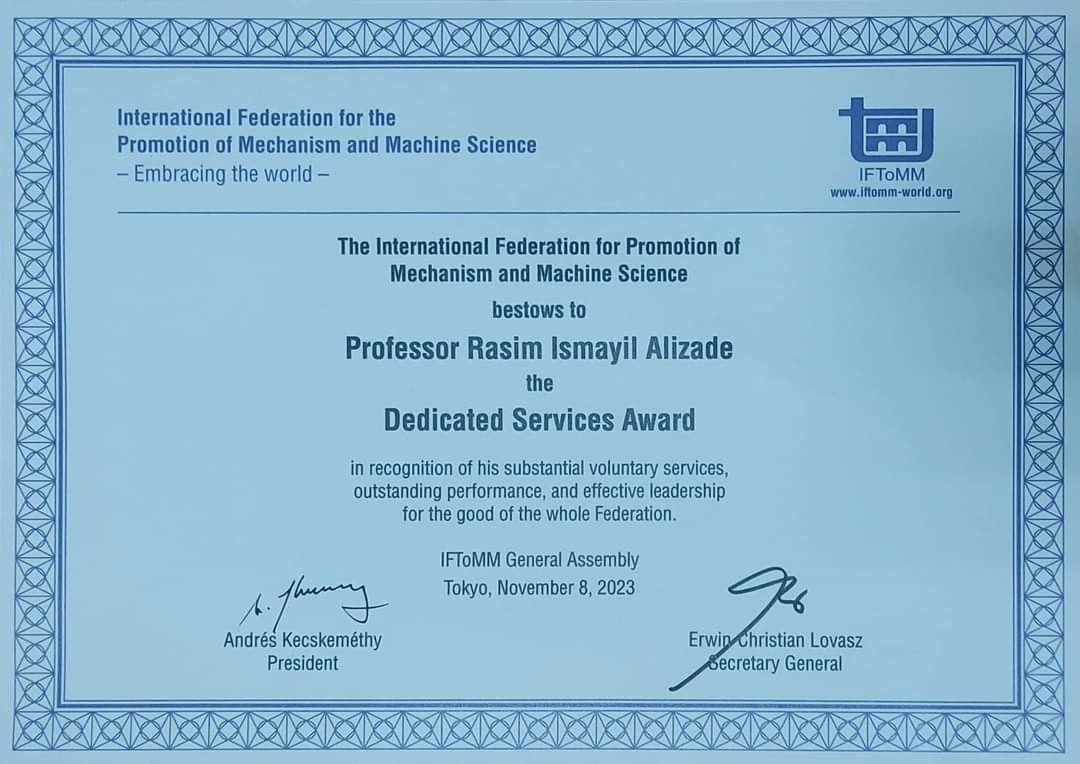 Azərbaycan Texniki Universitetinin (AzTU) Maşın dizaynı və sənaye texnologiyaları kafedrasının məsləhətçi professoru Rasim Əlizadə Yaponiyanın paytaxtı Tokio şəhərində keçirilən IFToMM WC 2023 (International Federation for the Promotion of Mechanisms and Machine Science) 16-cı Dünya Konqresində xidmətlərinə, elmi nəticələrinə və beynəlxalq federasiyanın işinə effektiv rəhbərlik etdiyinə görə xüsusi ləyaqət mükafatına layiq görülüb.