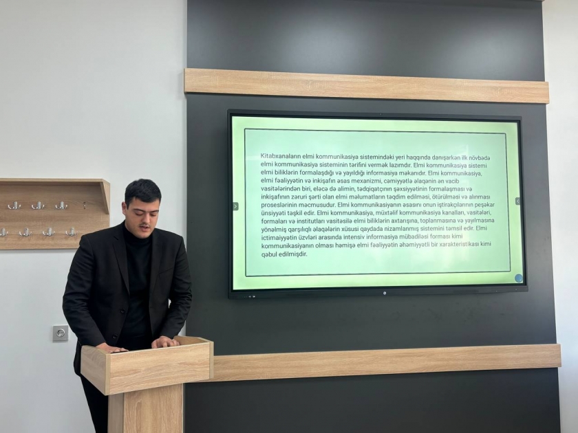 BDU-dan "Tehsil.biz"ə bildirilib ki, elmi seminarda Kitabxana-informasiya resurslarının idarə edilməsi kafedrasının doktorantı Yusif Əsədullayev mövzu ilə bağlı məruzə edib. Gənc tədqiqatçı əvvəlcə elmi kommunikasiya sisteminin tərifini verib, bu mühiti elmi biliklərin formalaşdığı və yayıldığı informasiya məkanı kimi xarakterizə edib. Bildirib ki, elmi kommunikasiyanın əsasını onun iştirakçılarının peşəkar ünsiyyəti, intensiv informasiya mübadiləsi təşkil edir: “Bu prosesdə kitabxanalar mühüm rola malikdir. Kitabxanalar bu sistemin vacib elementi kimi çıxış edir, elmi kommunikasiya mühitində sənəd axınının hərəkətini və ondan istifadənin istiqamətlərini müəyyənləşdirir, bütövlükdə prosesi yönləndirir”.