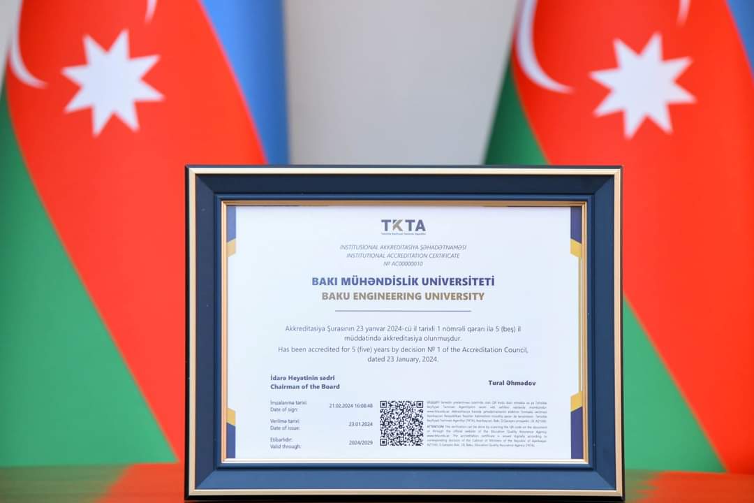 Elm və Təhsil Nazirliyi Akkreditasiya Şurasının müvafiq qərarı ilə Bakı Mühəndislik Universitetinin (BMU) 5 il müddətinə akkreditasiya olunması ilə bağlı şəhadətnamə ali təhsil ocağına təqdim edilib.