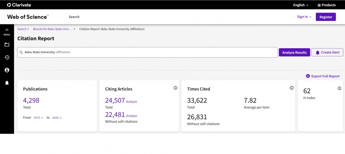 2023-cü ildə “Web of Science” bazasına daxil olan dərgilərdə BDU tərəfindən 277 əsər (2023-cü il üzrə yekun nəticələr tam deyil, 2024-cü ilin ilk yarımilliyində tamamlanacaq) nəşr edilib. Dərc olunmuş elmi əsərlərin 124-ü açıq girişə malikdir. Həmçinin cari ilin ilk 3 ayı ərzində bazaya daxil olan dərgilərdə BDU tərəfindən 38 elmi əsər çap edilib.