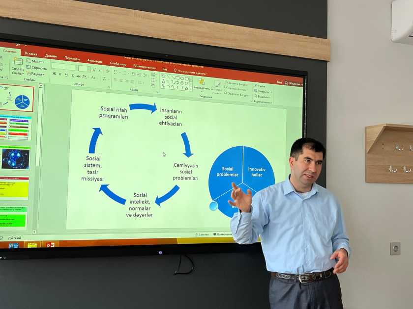 Bakı Dövlət Universitetinin Sosial elmlər və psixologiya fakültəsində İnnovativ həllər üzrə konsultant, Azərbaycan İnnovasiya Kommunikasiya Texnologiyaları Assosiasiyasının üzvü Mübariz Qasımov tərəfindən “Sosial innovasiyalar” mövzusunda təlim keçirilib.