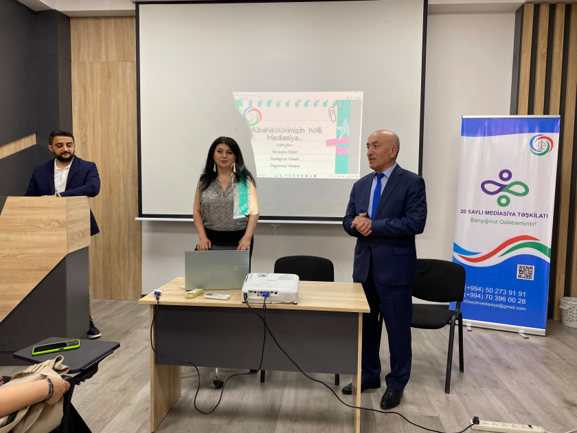 20 saylı mediasiya təşkilatının mediatorları Vüsalə Dadaşova, Nicat İsmayılov və Venera Əsgərova tərəfindən keçirilən təlimdə mediasiya xidmətinin mahiyyəti barədə tələbələrə ətraflı məlumat verilib. Qeyd olunub ki, mediasiya mübahisələrin məhkəmədənkənar həlli üsuludur. Mediasiya zamanı tərəflər mediatorun (vasitəçinin) köməyilə digər tərəfin mövqeyi barədə daha çox məlumat qazanır, öz mövqeyini yenidən qiymətləndirir və barışmaq imkanlarını araşdırırlar. Nəticədə əksər hallarda mübahisəli problemlər öz müsbət həllini tapır və məhkəməyə ehtiyac qalmır. Mediasiya konfidensial səciyyəlidir və tərəflərin məlumatları tam məxfi qorunur. Məhkəmədən fərqli olaraq, mediasiya prosesi daha qısamüddətli olur və tərəflərin vaxtlarına qənaət edilir.