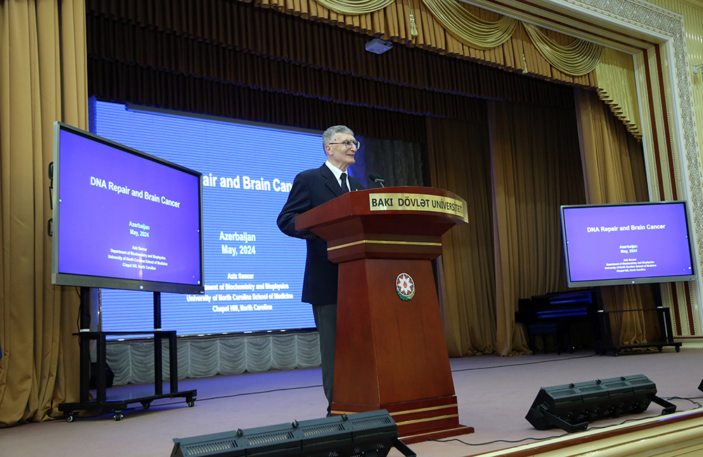 Sonra Nobel mükafatçısı universitetin akt zalında tələbə və müəllim heyəti üçün “DNT-nin bərpası və beyin xərçəngi” mövzusunda mühazirə oxuyub.