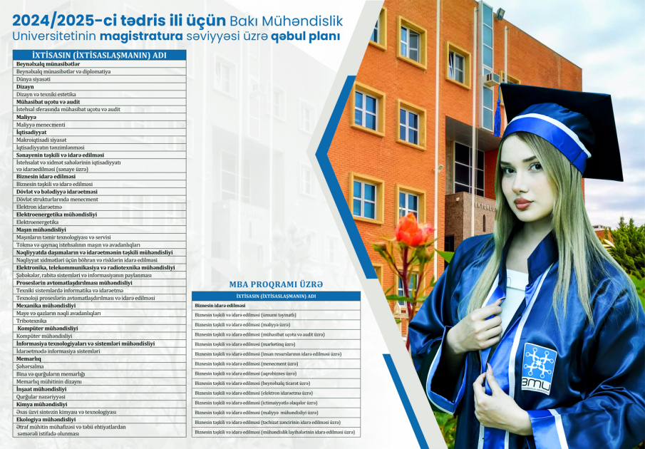 Bakı Mühəndislik Universitetinin (BMU) 2024/2025-ci tədris ili üçün bakalavriat və magistratura səviyyələri üzrə tələbə qəbulu planı, həmçinin MBA (Biznesin idarə edilməsi) proqramına plan yerləri təsdiqlənib.
