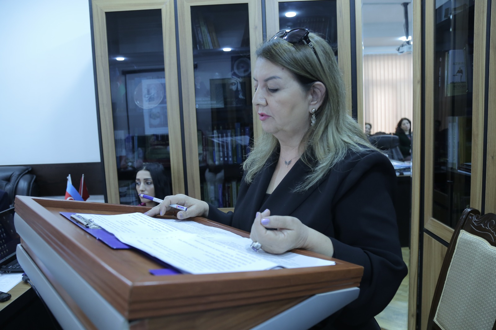 Filologiya üzrə fəlsəfə doktoru dosent Gülsümxanım Hasilova isə “Bəxtiyar Vahabzadə yaradıcılığında xalq deyimləri” mövzusunda çıxış edərək, şairin əsərlərində yer alan xalq deyimləri və atalar sözlərini təhlil edib. Alim qeyd edib ki, Bəxtiyar Vahabzadə xalq deyimlərindən yalnız sitat olaraq istifadə etməmiş, onları yenidən yaradaraq poetik biçimdə yeni həyat verib. Bu yanaşma şairin milli kimliyi qorumaq və xalq müdrikliyini gələcək nəsillərə çatdırmaq məqsədinə xidmət edir. “Onun əsərlərindəki atalar sözləri və məsəllər xalq ruhunun ifadəsi olan nümunələr kimi xalq ədəbiyyatı ilə yazılı ədəbiyyat arasında möhkəm bir körpü yaradır”, – deyə Gülsümxanım Hasilova vurğulayıb.